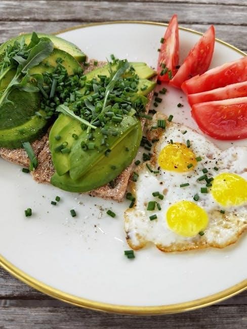 Balancing fats‚ carbohydrates‚ and proteins is crucial for a successful vegetarian keto diet. The keto diet emphasizes high-fat intake (70-80% of daily calories)‚ moderate protein (15-20%)‚ and very low carbohydrates (5-10%). Fats should come from healthy sources like avocados‚ nuts‚ seeds‚ and olive oil. Carbohydrates are limited to low-carb vegetables‚ such as leafy greens‚ broccoli‚ and cauliflower‚ to stay in ketosis. Protein sources include tofu‚ tempeh‚ eggs‚ and cheese‚ ensuring adequate intake without overconsumption. Tracking your macronutrient ratios daily helps maintain ketosis and supports weight loss. Aim to pair fats with proteins and vegetables at each meal to keep you full and satisfied. Regularly adjusting your macronutrient balance based on progress and dietary needs ensures long-term success on the vegetarian keto meal plan.
