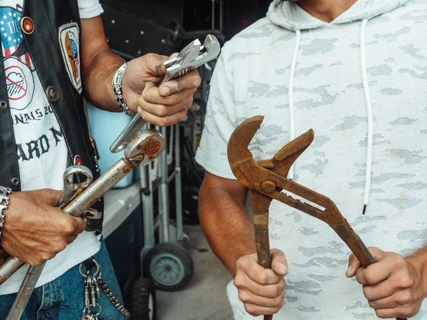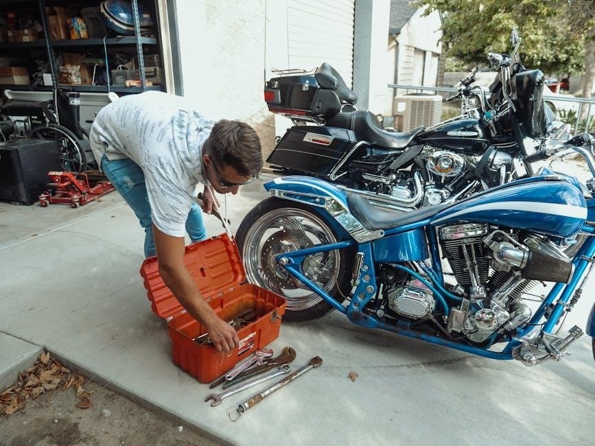 Motorcycle manuals highlight common issues like faulty electrical systems, engine misfires, and brake problems. Diagnostic techniques include checking error codes, inspecting wiring diagrams, and testing components. These guides help identify root causes, such as worn spark plugs or loose connections, ensuring accurate repairs. By following step-by-step instructions, riders can resolve issues efficiently, avoiding costly mistakes and prolonging their bike’s lifespan. Effective diagnostics are crucial for maintaining performance and safety on the road.