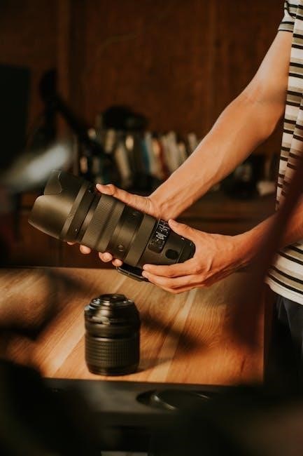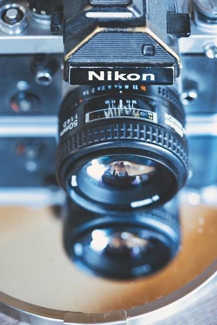 Use a soft‚ dry cloth to gently wipe the camera body and avoid harsh chemicals. For lenses‚ employ a microfiber cloth to remove smudges. Regularly inspect and clean the viewfinder and mirror to ensure optimal performance. Avoid touching lens surfaces to prevent fingerprints and scratches. Store lenses with caps on to reduce dust exposure and maintain clarity in your photographs.
